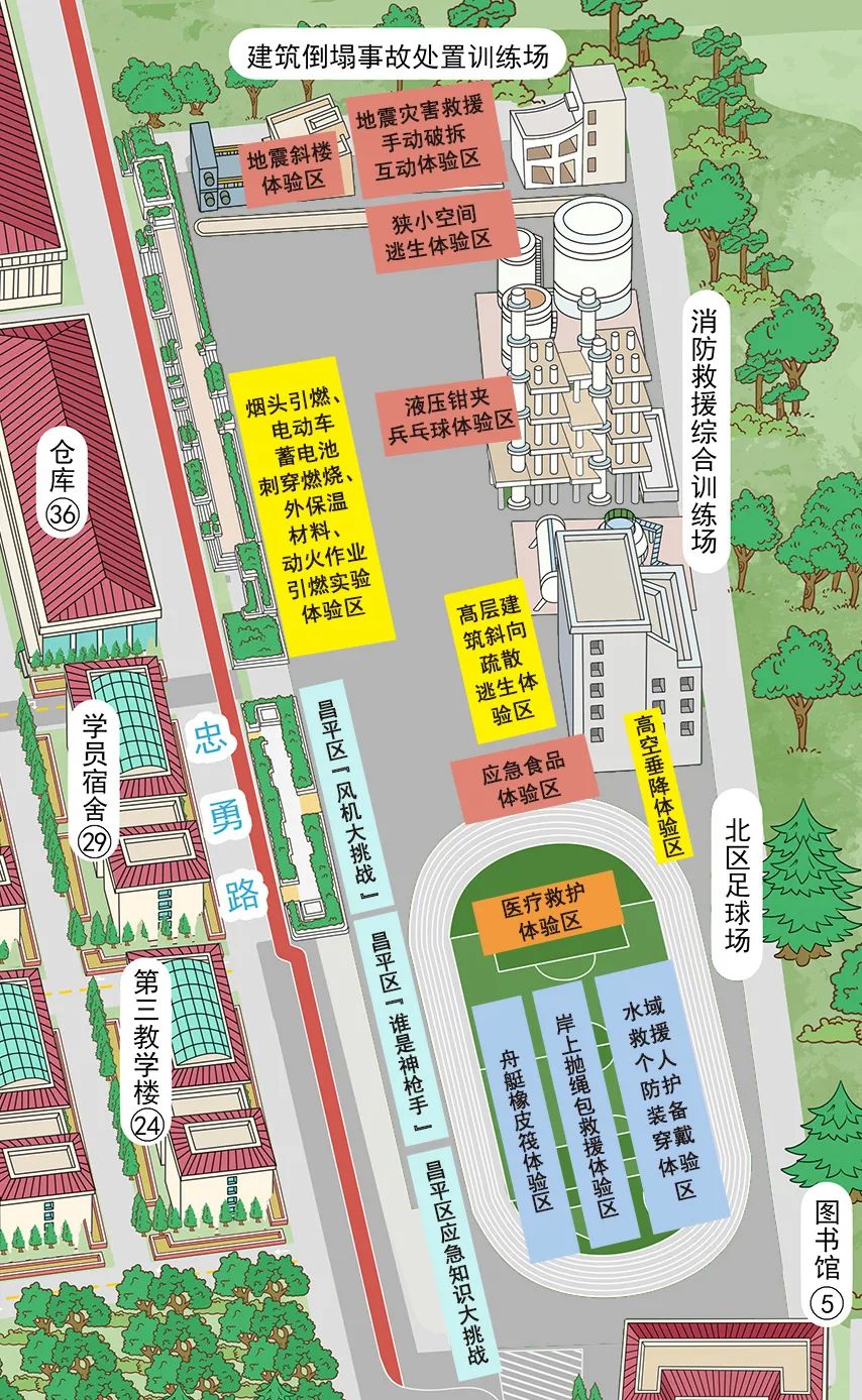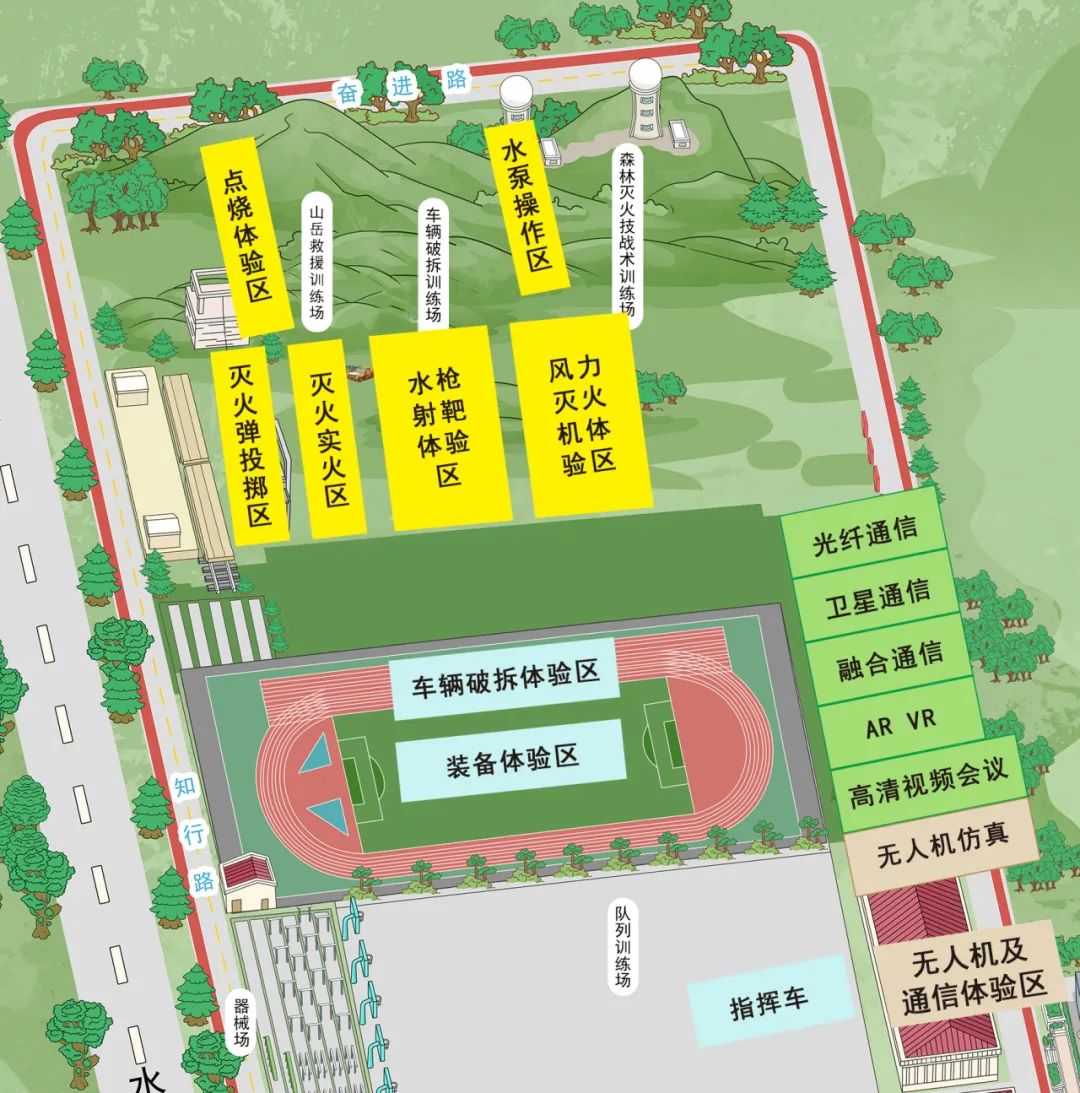 4.互动体验。依托学院林火、地震、山岳、水域、无人机5支专业分队,结合实战化训练场景,面向群众设置33种体验科目。