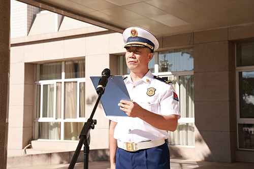 参训师生在基础训练教研室罗士英教官的带领下,面向中国消防救援队队旗,庄严宣誓。
