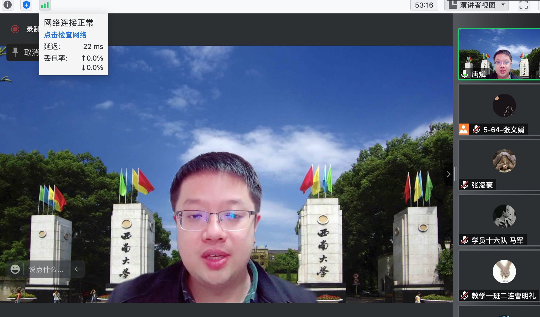 最后,唐斌教授对同学们提出的问题做出了恳切的回答,同时寄语同学们:“做一次理论宣讲不难,把理论宣讲好,把理论宣讲这个事情做好,把理论宣讲这个事情一直做好,我们需要为之付出很多的努力,一直做好要付出更多的努力。希望大家在社团指导老师们的倾心指导下,在志同道合的同学们的共同努力下,依托各种资源力量,把社团建设好,把理想信念传承好,把我们热爱的事业打造好”。