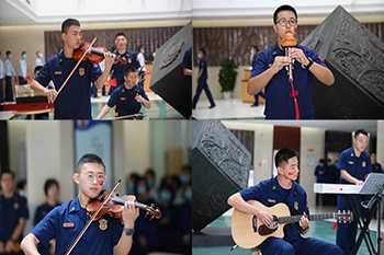 此次活动包括吉他、小提琴、钢琴、二胡、竹笛等7种乐器,内容丰富,充分发挥了学员特长,培养了学员综合能力,激发了学员的爱国热情。该演出活动现场气氛热烈,演出人员激情洋溢,乐曲演绎兴云致雨,展现出了学员最好的风采。曲目《浏阳河》绵长厚重,《夕阳山顶》悠远空灵,《我和我的祖国》热情激昂。演奏结束后,全场合唱《我和我的祖国》。在致敬伟大祖国的红幕下,掌声雷动,全场气氛达到高潮。