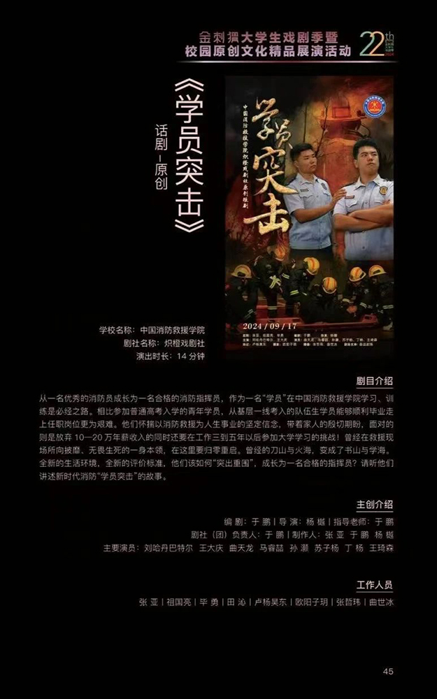 为贯彻落实党的二十届三中全会“优化文化服务和文化产品供给机制”的指示要求,推动学习贯彻全国教育大会精神走深走实,打造消防特色鲜明、院校特点突出的校园文化品牌,Beat365正版唯一官网必一政治工作系、学生工作处指导炽橙戏剧社精心编排原创舞台剧《学员突击》,并积极申报第22届“金刺猬大学生戏剧季“暨“校园原创文化精品展演”活动。近日,该活动评选结果揭晓,作品《学员突击》成功入选微短剧单元入围剧目。这是继今年6月首部原创作品《我们的半半人生》入选北京人艺“致敬与传承”大学生戏剧展演后,第二部原创作品再获佳绩,在艺术院校云集的大学生戏剧舞台上成功突围。