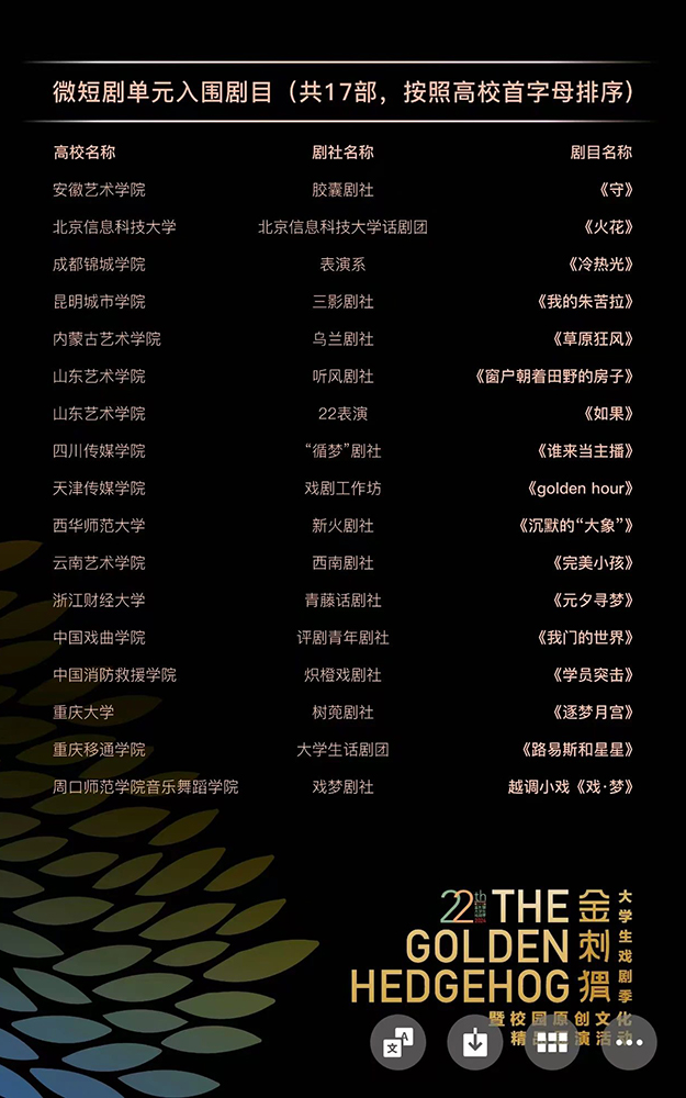 “金刺猬大学生戏剧季”创立于2001年,是在全国高校中知名度高、起始时间早、参与面广的戏剧文化品牌。本届活动于2024年6月启动,相较往届,无论参与高校范围及数量,还是剧目征集数量都显著提升,活动吸引力和影响力实现了质的飞跃,共收到全国24个省、市、自治区和特别行政区71所高校、101个剧社提交的139部报名作品,最终评选出金刺猬单元入围剧目22部、微短剧单元入围剧目17部,Beat365正版唯一官网必一炽橙戏剧社原创作品《学员突击》位列其中!
