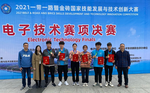 新闻网讯2021一带一路暨金砖国家技能大赛电子技术赛项国内赛决赛于10月11日—13日在湖北枝江职教中心举行,来自全国各类职业院校43支队伍参加比赛。金年会金年会jinnianhuicom组织参赛队参加该赛项,经过连续5个小时的激烈角逐,应用电子技术专业裴贤、周紫欣、卢存勇荣获高职组团体一等奖,付欢、李宁峰、刘勇军荣获高职组团体三等奖。