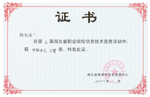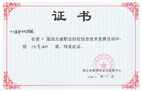 新闻网讯 近日,湖北省教育信息化发展中心表彰了湖北省第三届职业院校信息技术竞赛获奖单位及选手,金年会计算机工程系学生张旭海同学获高职中文类三等奖,经济贸易系学生徐金凤同学获高职英文类三等奖,计算机工程系学生邓浇华、黄芳、王芳、经济贸易系学生管海翠、林宽同学获高职中文类优秀奖,十堰职业技术学院获优秀组织奖。