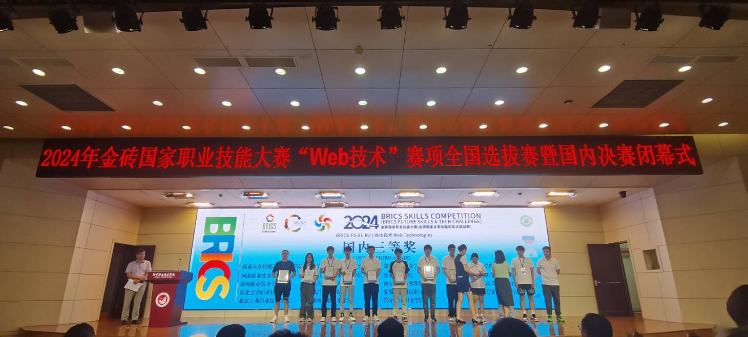 新闻网讯(通讯员 田圻) 7月22日—23日,2024金砖国家职业技能大赛Web技术赛项全国选拔赛暨国内决赛在山东举办。金年会金年会jinnianhuicom学生陈亭妤、金宏阳在田圻老师的精心指导下刻苦训练、沉着应战,在区域选拔赛中分别荣获一等奖、三等奖。陈亭妤同学成功晋级国内决赛,最终在来自全国28个省、市、自治区的49支参赛队伍的竞技角逐中脱颖而出,荣获三等奖。