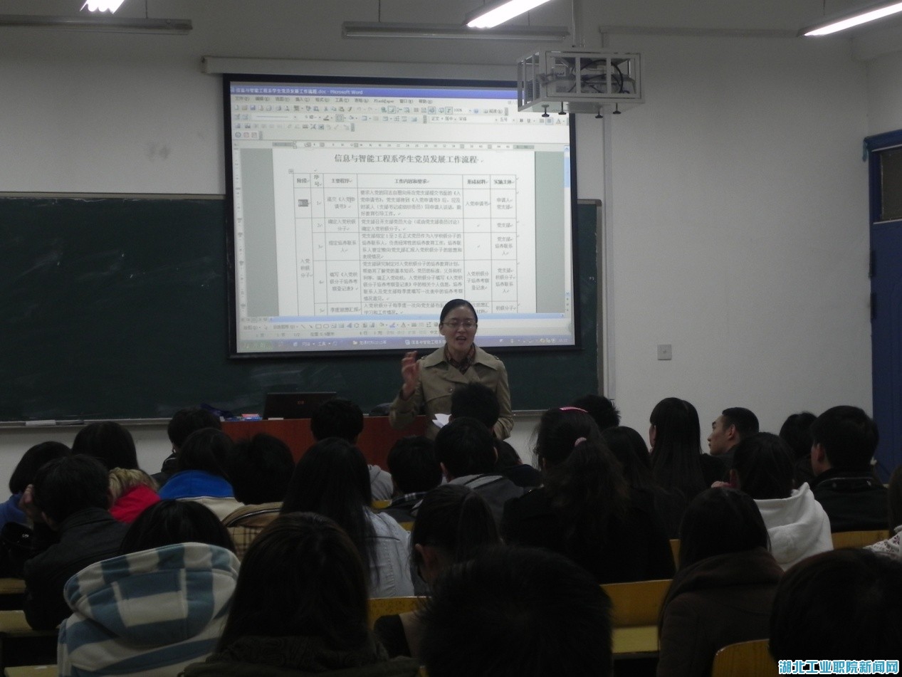 新闻网讯(学生记者 谢竹115日晚,信息与智能工程系组织2013级新生及2012级入党积极分子在4401教室召开学生党员发展工作流程座谈会。辅导员陈黎及肖玉参加了本次活动。座谈会由该系党总支书记莫足琴主持。