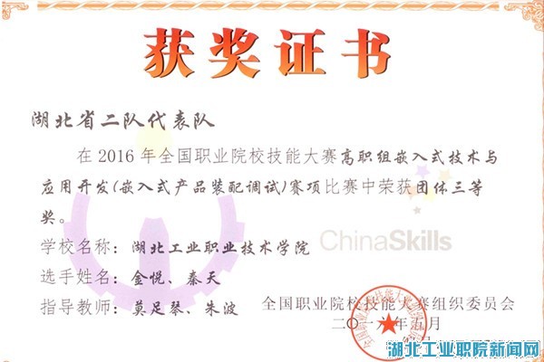 新闻网讯(通讯员 彭远)5月8日,经过长达8个小时紧张而持久的竞赛,在全国150多个参赛团队激烈角逐中,2016年全国职业院校技能大赛高职组“嵌入式技术与应用开发”赛项在天津落下帷幕,金年会信息与智能工程系物联网应用技术专业杨雯娟、嵌入式技术与应用专业段宏飞两名同学获得“嵌入式产品应用开发”团体二等奖,物联网应用技术专业金悦、秦天两名同学获得“嵌入式产品装配调试”团体三等奖,成为湖北在该赛项本年度获奖级别最高、获奖项目全覆盖的唯一参赛院校。