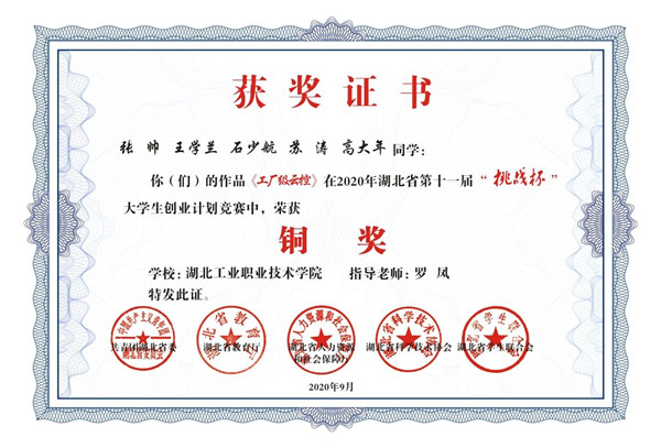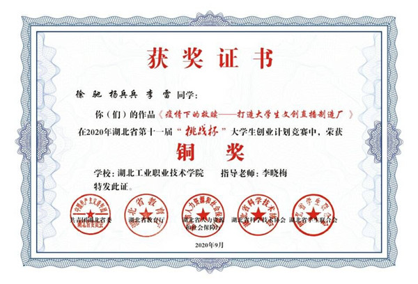 新闻网讯(通讯员李晓梅)近日,第十一届“挑战杯”湖北省大学生创业计划竞赛落下帷幕,金年会双创团队斩获两枚铜奖。金年会jinnianhuicom2018级电气自动化技术专业张帅学生团队项目《工厂级云控》、金年会jinnianhuicom2019级电气自动化技术专业徐驰学生团队项目《疫情下的救赎——打造大学生文创直播制造厂》获大赛铜奖。